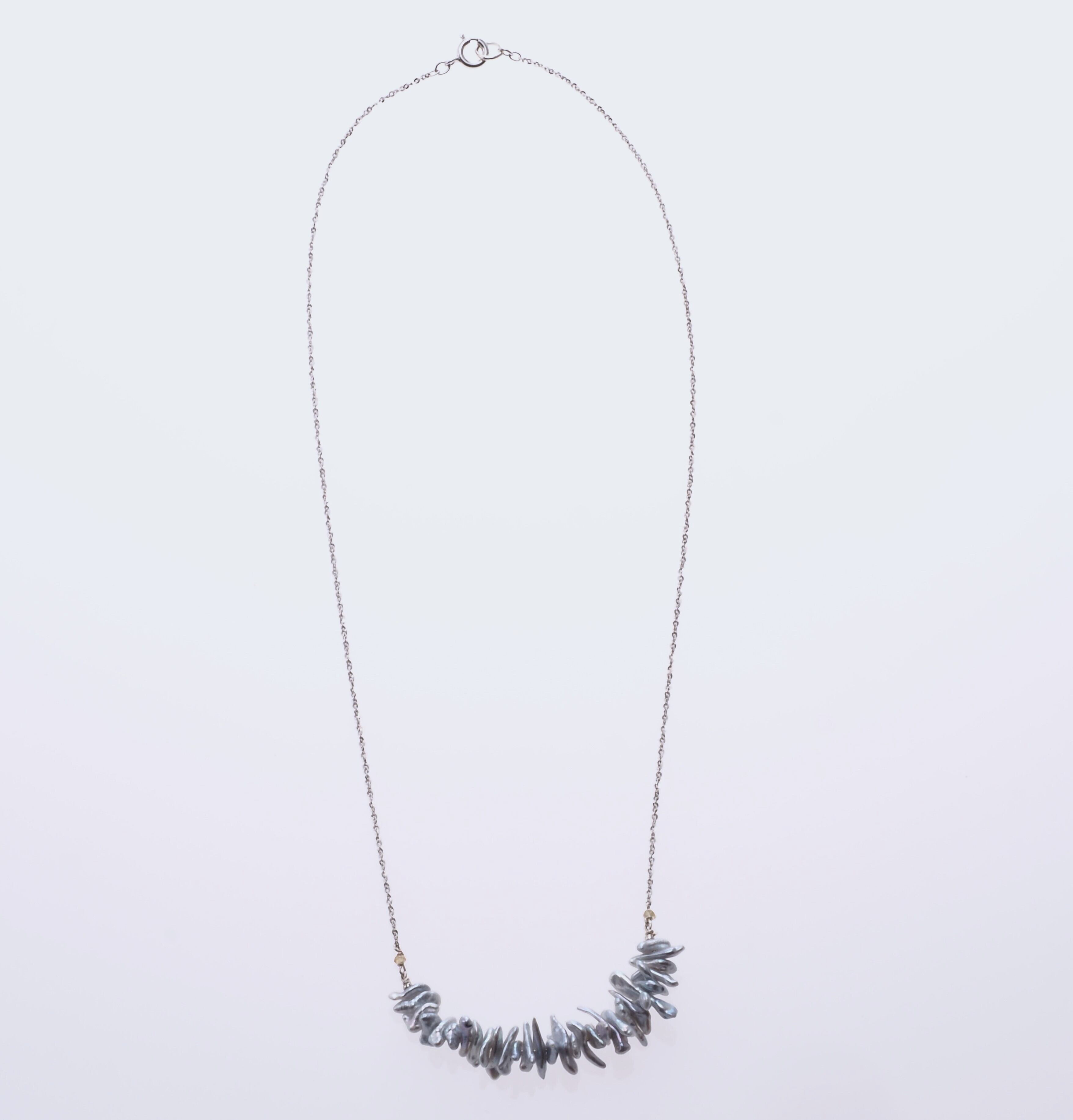 This necklace features naturally formed Akoya keshi pearls in unique blue-gray hues and organic shapes, carefully strung in a vertical arrangement. Each pearl tells its own story, creating a piece that feels both elegant and one-of-a-kind.